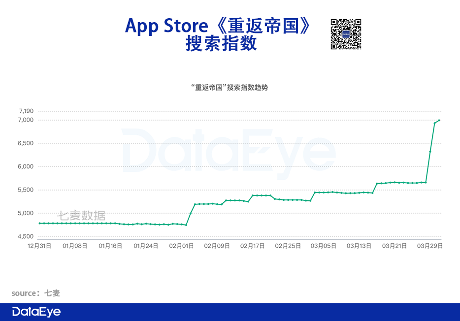 App Store的搜索指数持续走高。从苹果App Store的搜索指数来看,近几个月重返帝国搜索趋势不断攀升,目前已高达6990(《三战》《率土》《文明》《万国》目前都在6500-7000水平)。可见,越来越多的用户对游戏产生兴。游戏前期营销预热、导流有一定成效。特别是2月初《重返帝国》登峰测试前的一波造势,让App Store的搜索指数陡然上升。