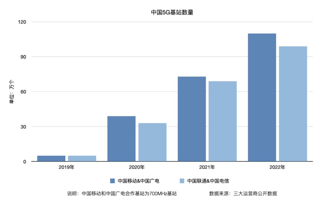 根据中国移动的公开数据,2019年建设的5G基站约为5万个,2020年和2021年5G相关资本开支分别为1025亿元和1140亿元,计划2022年的相关投入为1100亿元。以2022年底为时间点进行统计,中国移动累计开通的5G基站将达到110万个,其中和中国广电联合建设的700MHz基站约为48万个。