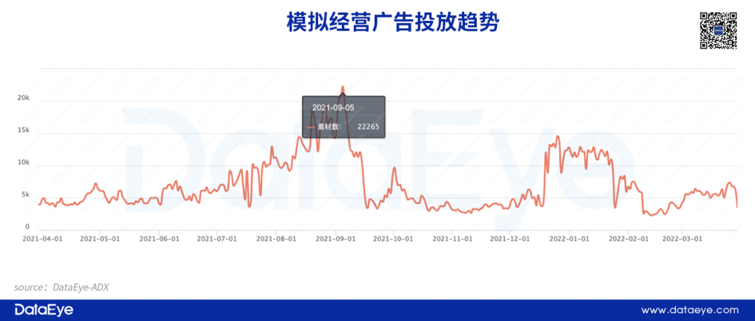根据DataEye-ADX数据显示,各大模拟经营厂商自2021年下半年纷纷下降了广告素材投放,并在2022年开年之际加大了投放量。