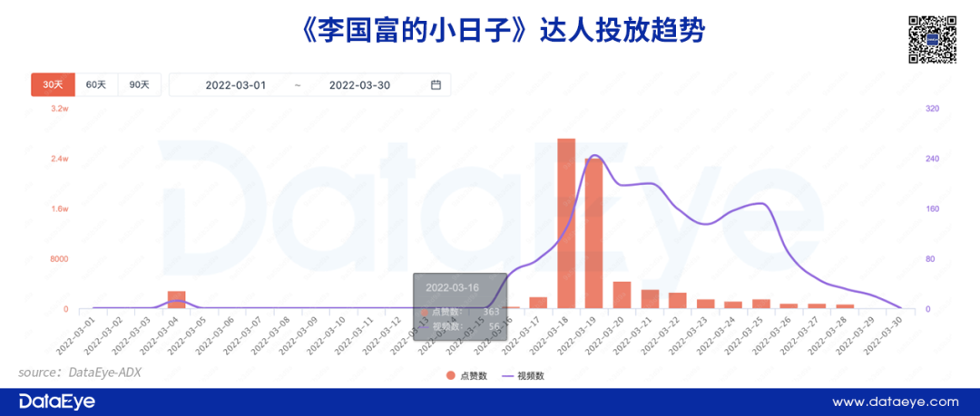 与《叫我大掌柜》相反,《李国富的小日子》选择将投放重心放在达人视频侧,DataEye-ADX显示,自今年3月16日起《李国富的小日子》明显增加了达人视频投放的资源,短短半个月时间,就与980名达人投放了1714条视频广告。