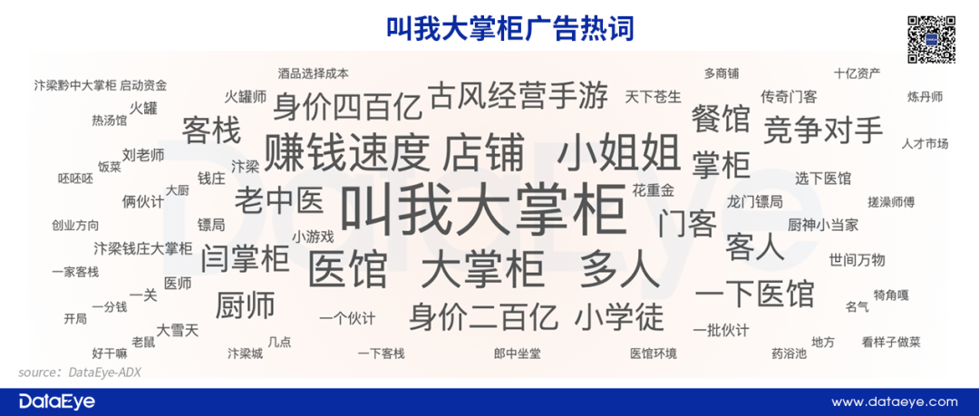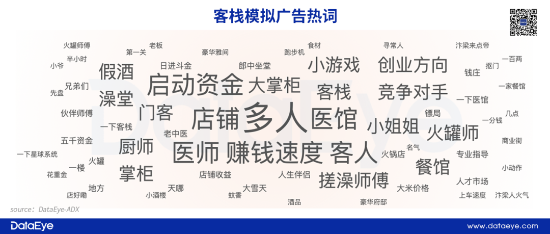 DataEye研究院统计发现此类游戏的广告热词具有高重合度,“启动资金”、“赚钱速度”、“店铺”、“掌柜”等词汇出现频率较高,这意味着此类词汇是当下模拟经营类玩家较为关注的。