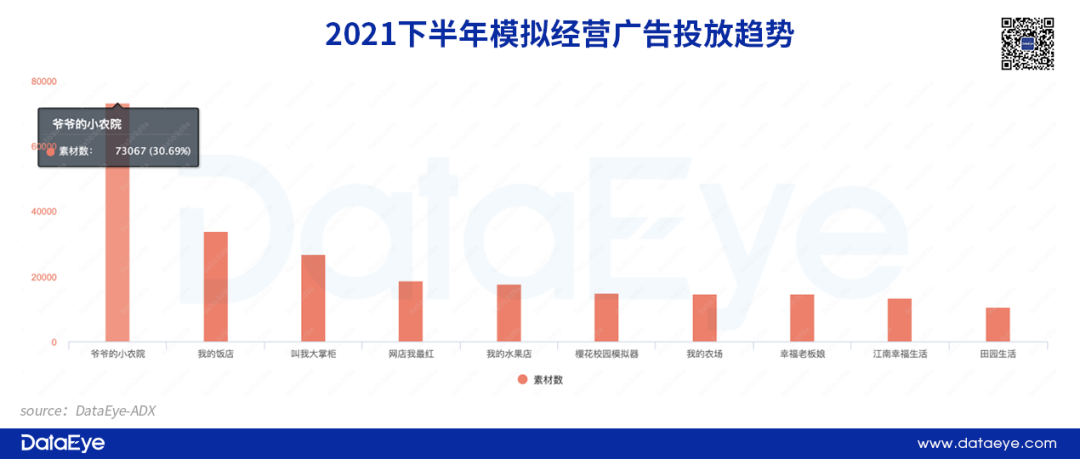 如果把时间线往前推,在2021年下半年中,占据经营类投放榜单前三名的分别是《爷爷的小农院》、《我的饭店》以及《叫我大掌柜》。