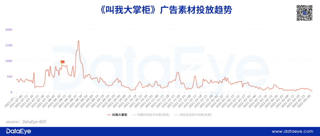 自2021年8月27日之后,《叫我大掌柜》在买量市场的素材投放量肉眼可见的减少。