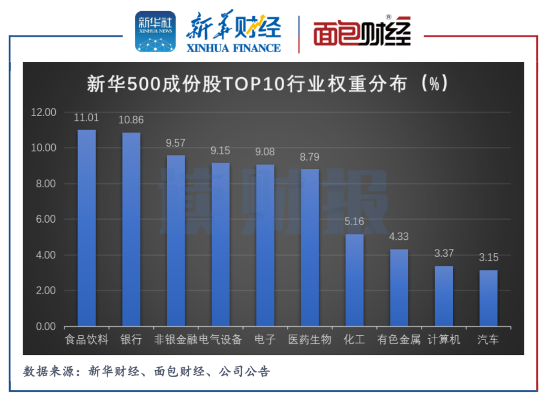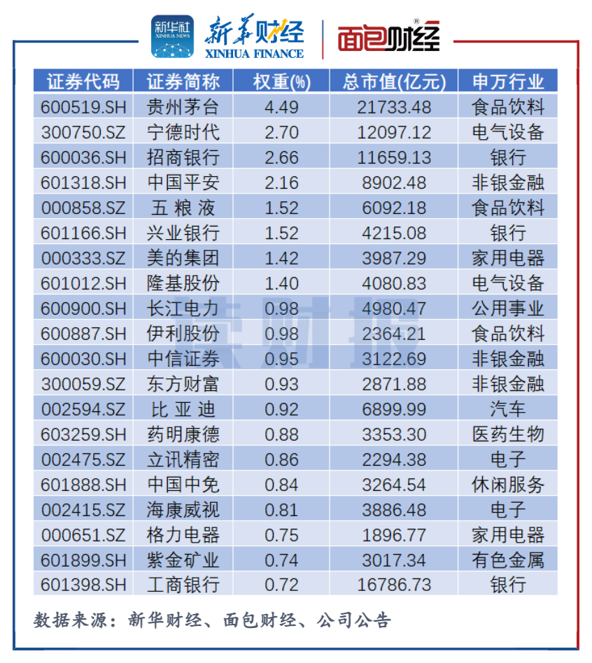 新华500 指数的权重成份股中,前十大成份股的权重合计为 19.83%,前二十大成份股的权重合计为 28.23%,成份股的权重分布相对均衡。具体来看,权重股中除消费、金融、家电等行业的白马股外,新能源龙头股也赫然在列,其中宁德时代、隆基股份等都已进入前十大成份股。