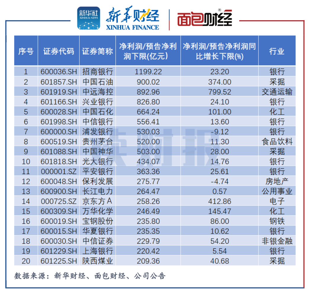 按已公布业绩或净利润预告下限的公司来看,38家预计净利润超过百亿元。招商银行2021年度实现归母净利润1199亿元,中国石油预计实现归母净利润下限为900亿元,中远海控实现净利润为893亿元,位列新华500成份股中前三名。