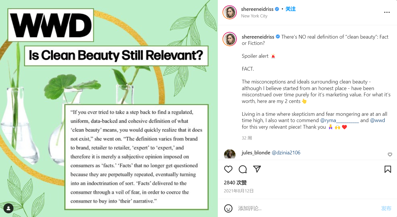 多个博主和皮肤科医生开始在社交媒体上公开发出对于Clean Beauty概念和市场价值的质疑。