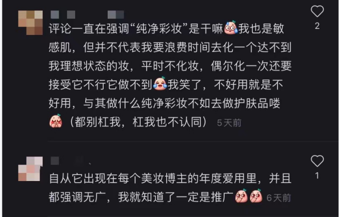 在小红书上,某博主推荐的国产纯净美妆评论下面,有消费者直言不讳,“产品不行就是不行,不行还要灌输观念让我接受。这么强调敏感肌适用,强调什么纯净美妆,不如直接说功效”。