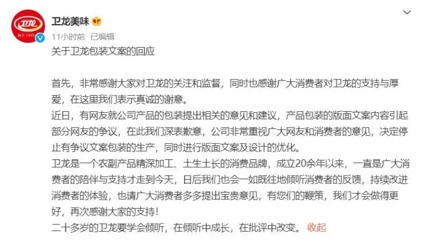 久而久之,大家对此已经到了深恶痛疾的地步,这也是为什么卫龙用了四、五年的包装会突然被骂上热搜的最主要原因,为此卫龙确实应该道歉。