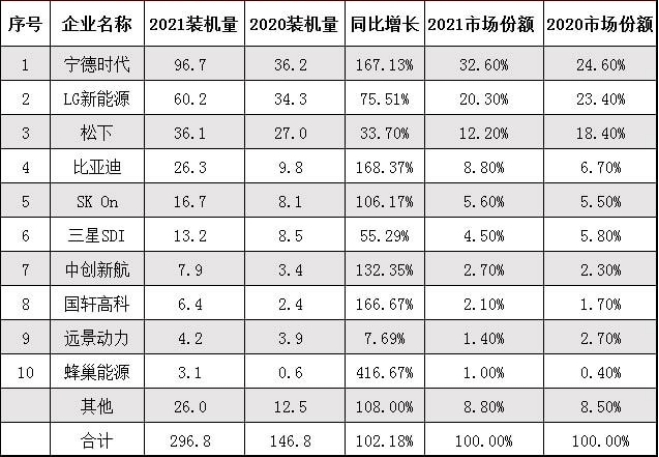 2021年,新能源渗透率不断走高,动力电池的需求也在不断增加,根据SNE Research数据,凭借416.67%的增速和3.1GWh的装机量,蜂巢能源挤进全球动力电池装机量前十。