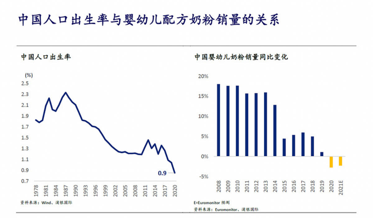 2019年之后,国内出生率大幅下滑,婴幼儿配方奶粉销量在2019年大幅放缓至1%,并在2020年首次出现负增长。从政策端来看,无论是开放三胎政策还是教育减负政策,决策端对未来人口形势并不乐观。