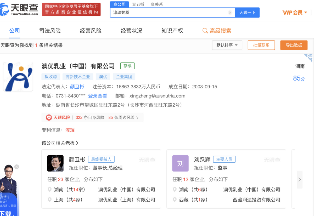 天眼查APP搜索关键词淳璀奶粉显示相关结果为澳优乳业,据悉,淳璀是澳优乳业推出的第一款有机奶粉。