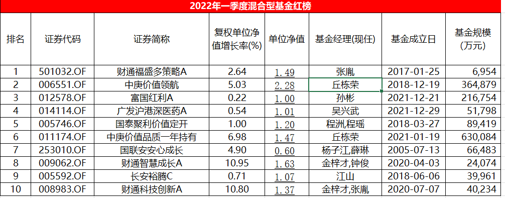 排在第一位的是财通福盛多策略,该基金成立于2017年1月25日,作为发起式基金,一季度的增长率为2.64%。从净值增长率来看,虽然仅为个位数,但该基金的波动率较低,远远领先于红榜上的其他基金。今年3月24日,该基金第一基金经理夏钦离任,由张胤独自管理。截至2021年底,基金规模为6954万元。