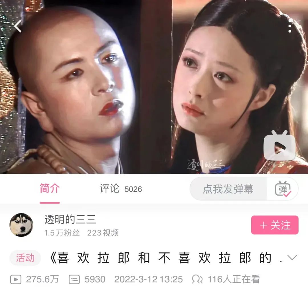 近日,B站上一条演绎唐僧与华妃之间爱恨情仇的拉郎视频火了,该视频集爱情、宫斗、穿越、搞笑等情节于一体,剧情丝滑且剪辑流畅,发布不足一个月便收获了近三百万播放量。