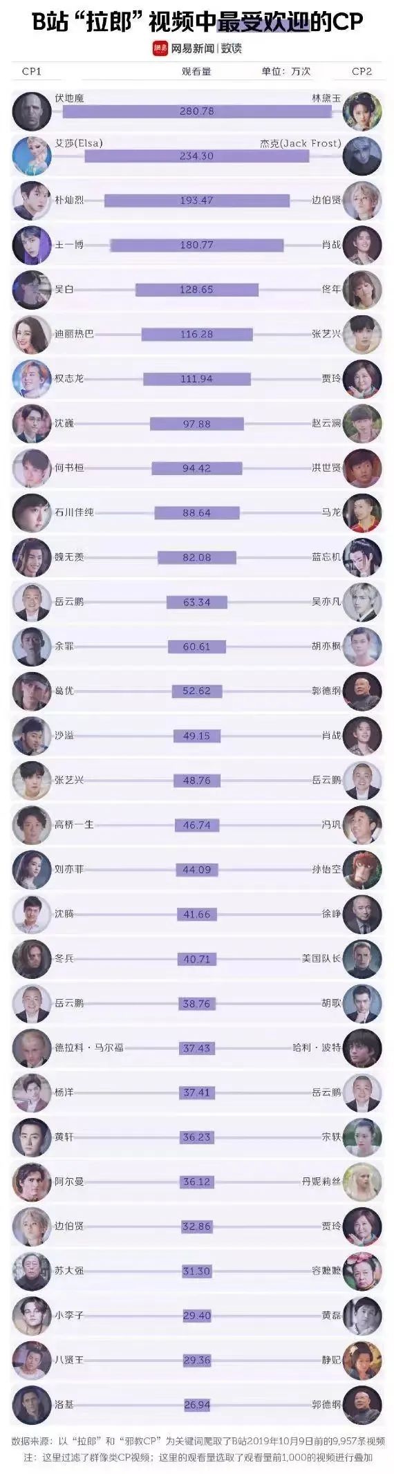 2020年前后,网易新闻曾统计过B站拉郎视频中最受欢迎的30对CP,当时林黛玉与伏地魔便排在榜首。整体来看,该榜单中一半为较为常规的拉郎CP,比如朴灿烈与边伯贤、迪丽热巴与张艺兴、冬兵和美国队长等,一半则为不走寻常路的拉郎CP,如权志龙与贾玲、葛优与郭德纲等。