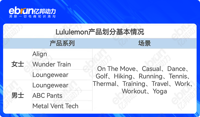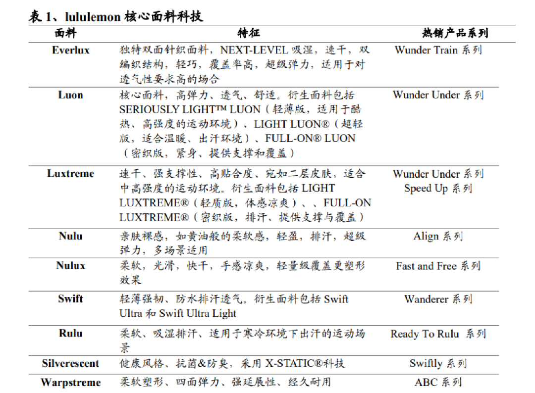 Lululemon拥有Everlux轻薄顺滑面料、Luon高弹透气面料、Nulu裸感亲肤面料等9种核心面料科技,并推出相关热销系列产品,如Align系列、Wunder Under系列等。