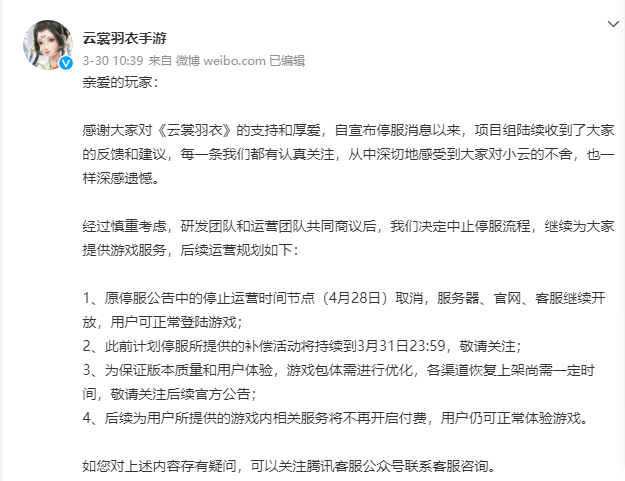 3月30日,《云裳羽衣》运营团队发布公告称,将“中止停服流程”,恢复在各大手机应用商店的上架。玩家们在抗争了一个多月后,取得阶段性胜利。