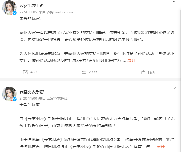 玩家们除了通过国家互联网信息服务平台、工信部、12315等渠道举报外,还在CCTV、中国消费者报等媒体的社交账号下留言投诉。最终,《云裳羽衣》暂时取消了停服计划,相关消息一度冲上微博热搜榜第7位。