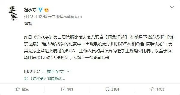 例如,2019年4月,知名游戏主播PDD(真实姓名刘谋)在参与网易《逆水寒》的一场比赛时,遭遇系统bug被判出局,而主办方并未第一时间妥善处理。PDD一怒之下,在直播间里公开删号退游。