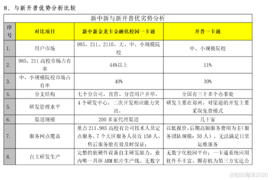 根据网友@知识海洋2020上传的调研报告显示,新中新对985、211等高校市场占有率高达44%以上,对中小规模院校市场占有率也达到了40%。目前尚不清楚数据来源与真实性,但显然与新开普所宣传的“主营的校园信息化产品覆盖千余所高校,市场占有率逾45%”有冲突之处。