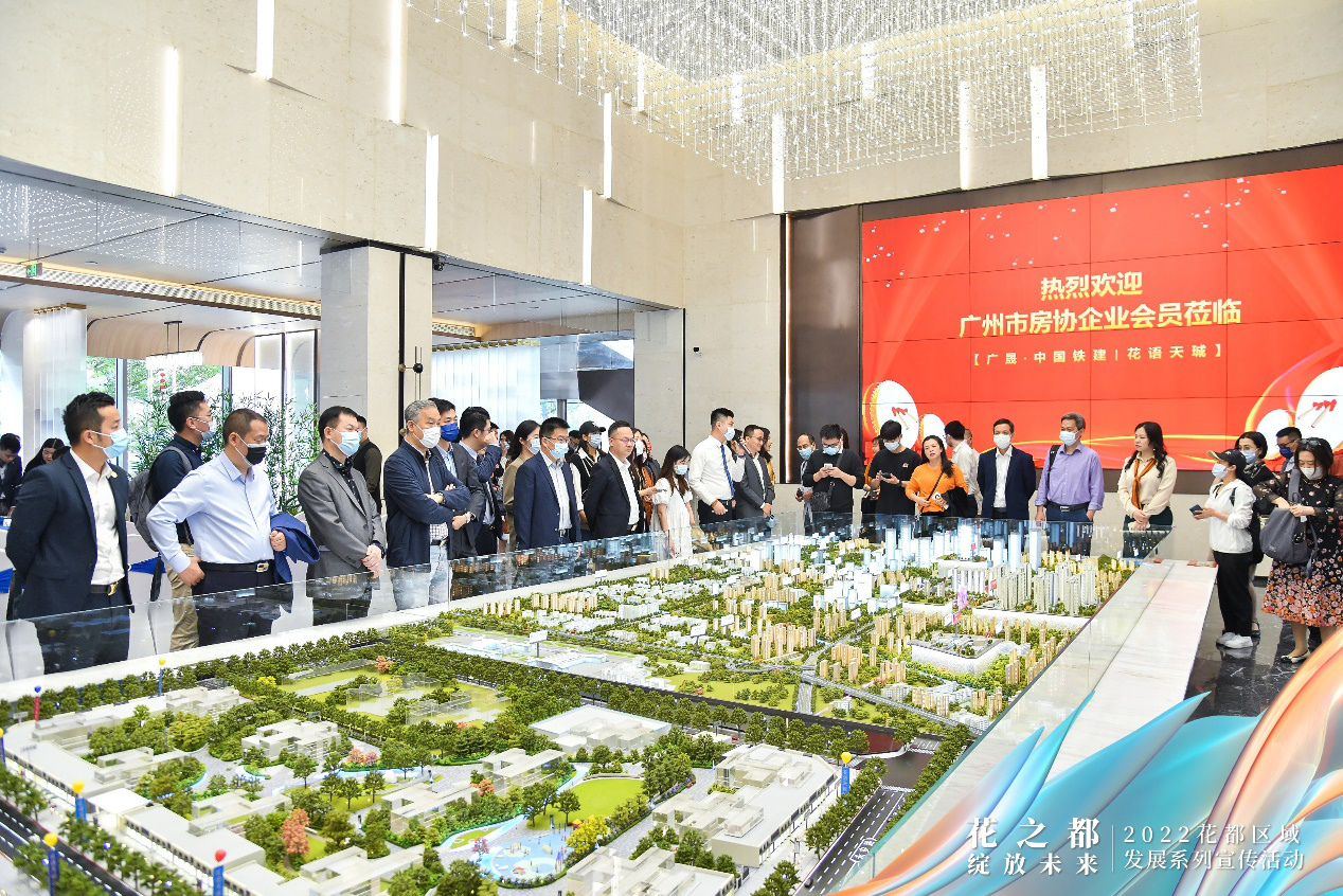 为助力花都高质量发展、建设宜居宜业的精致花都,由广州市房地产行业协会主办的“花之都·绽放未来——2022花都区域发展系列宣传活动”正式拉开帷幕。3月31日上午,由陆毅执行会长带队,市房协专家委、媒体委以及会员代表一行走进——广晟·中国铁建花语天珹,开启了2022年花都区巡盘品鉴活动的首站。