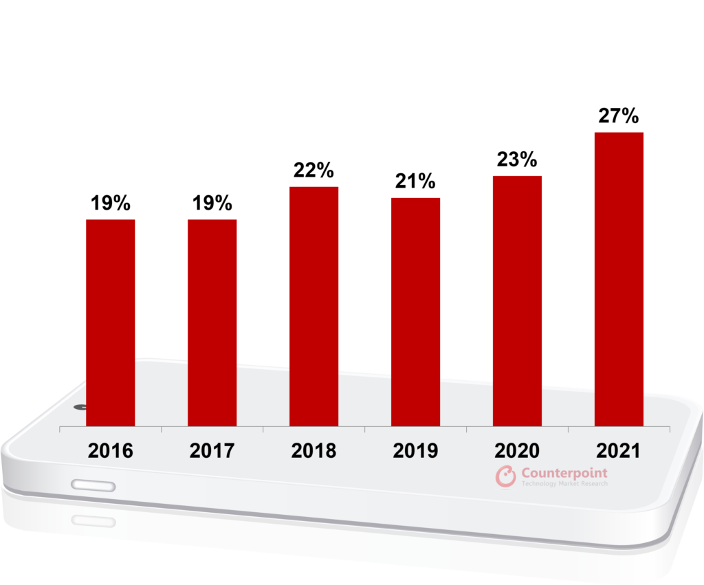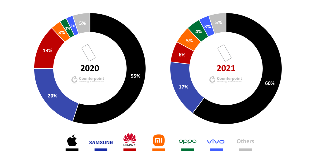 ▲2021年全球400美元以上智能手机销量份额,来源:Counterpoint