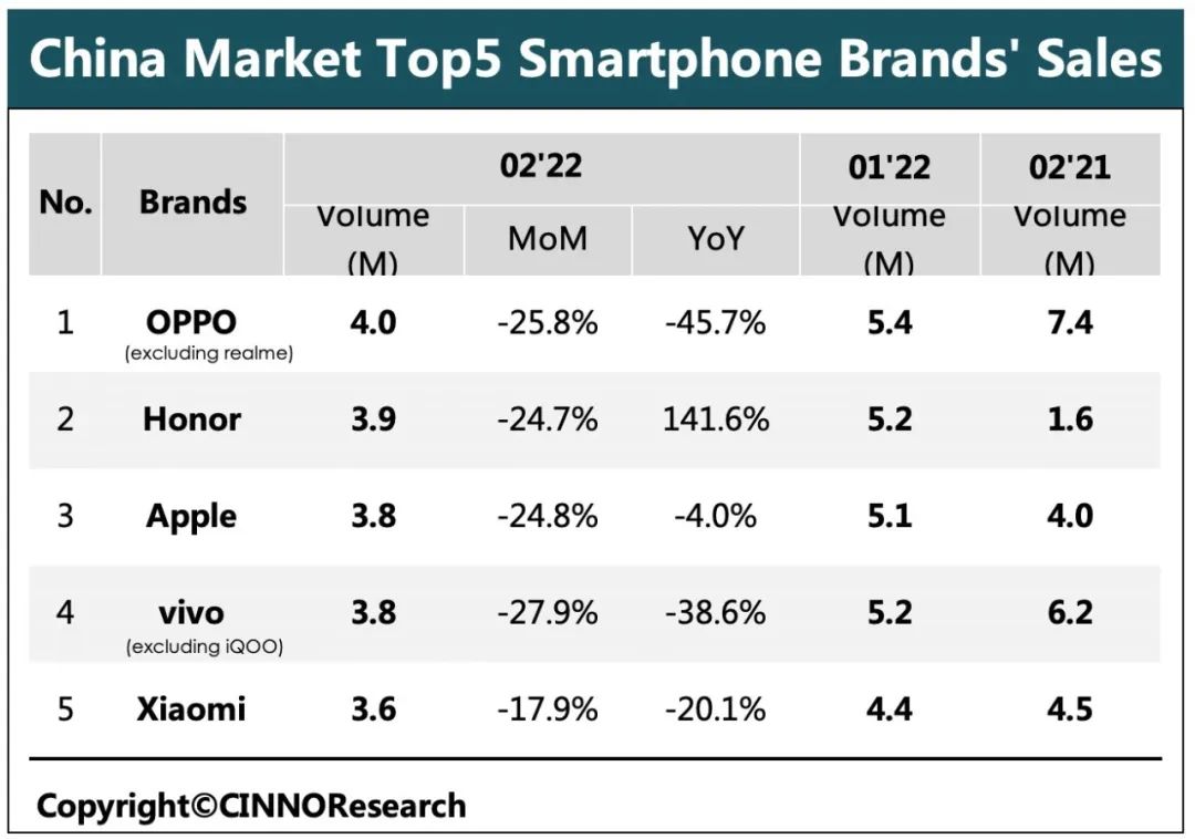 ▲2022年2月国内TOP5手机品牌销量,来源:CINNO