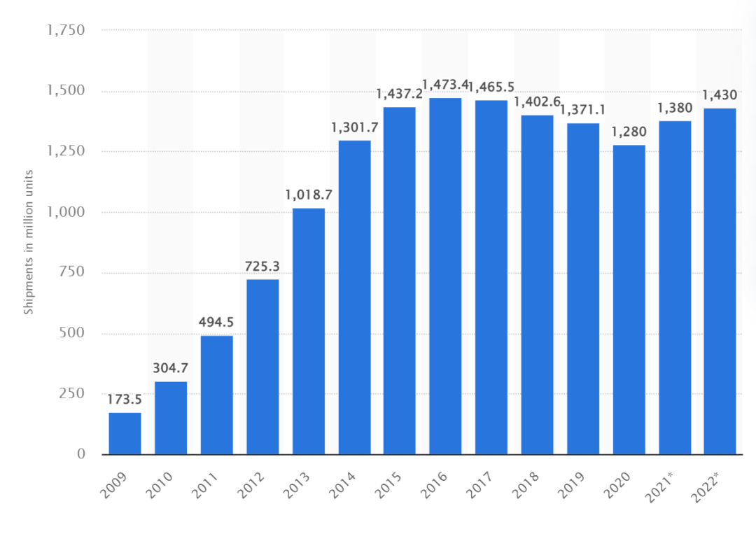 ▲2009-2022全球智能手机出货量统计及预测,数据来源:Counterpoint