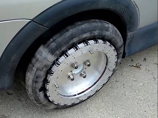 William所设计的这款轮胎,外形就像甜甜圈一样,轮胎本身可以在车轮轮毂上移动,让车辆横向滑动,旋转,看上去车辆像是在月球上行走一般。