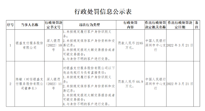 近日,央行深圳市中心支行网站公布的行政处罚公示表显示,银盛支付服务股份有限公司(下称)因存四项违法行为,被罚款2245万元。作出处罚的日期为2022年3月21日。