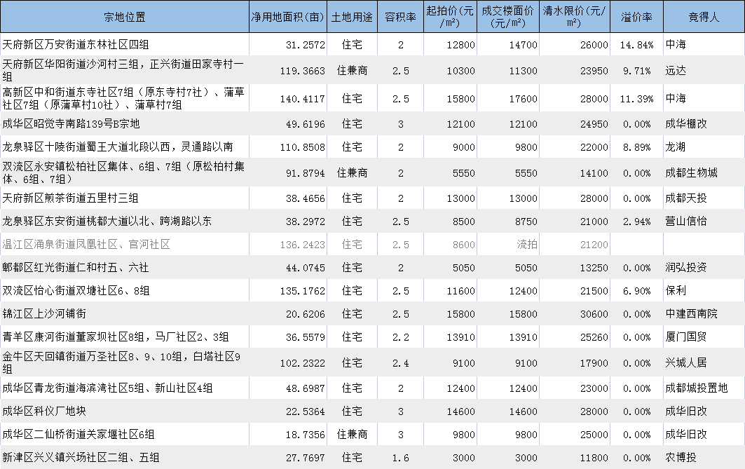 第二日上午场共6宗地块亮相,高新区和天府新区的地块热度自然不虚担心,不过中海分别竞得万安北和新川板块地块,此番集中供地已收下3块宗地,足显豪迈。龙湖则继续在龙泉驿区布局加码。