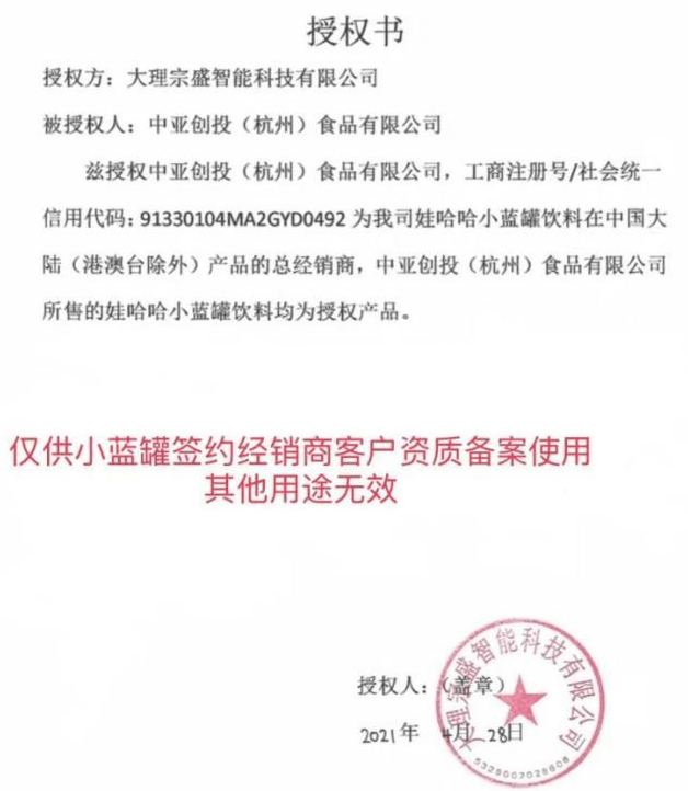 根据经销商提供的一份授权书,2021年4月28日,宗盛科技授权中亚创投为娃哈哈小蓝罐饮料在中国大陆(港澳台除外)产品的总经销商。