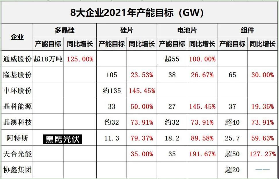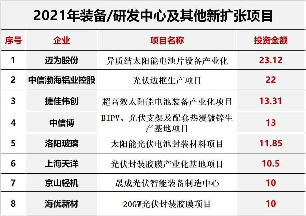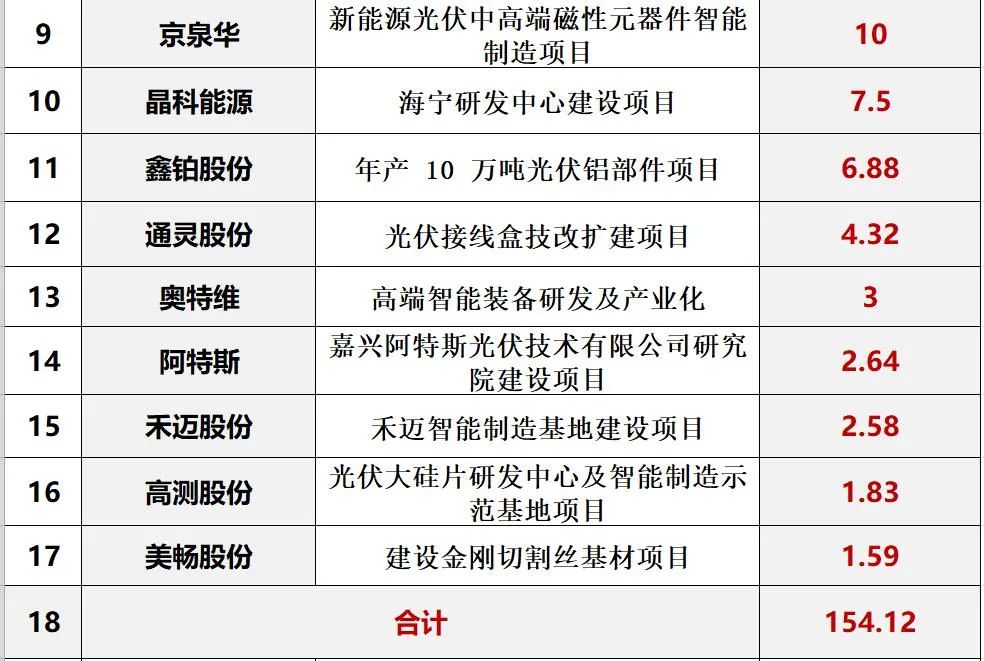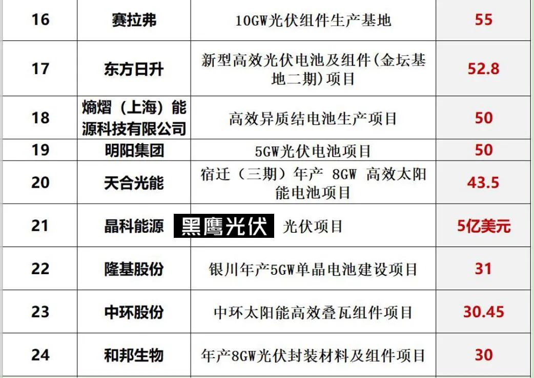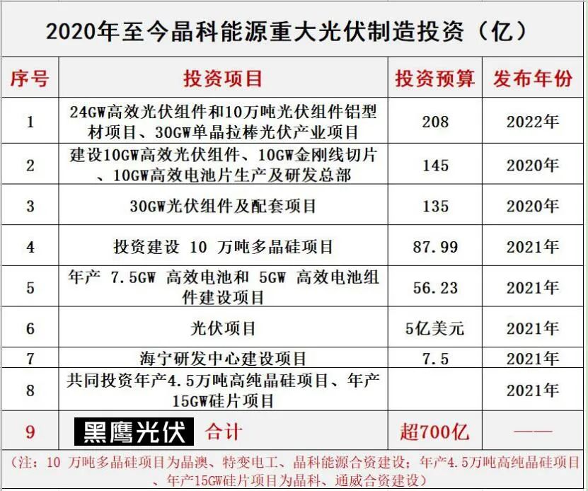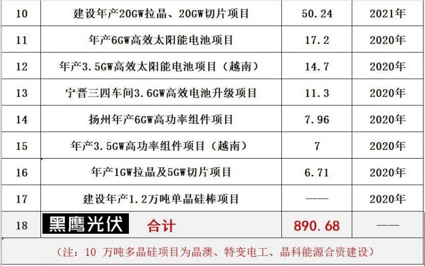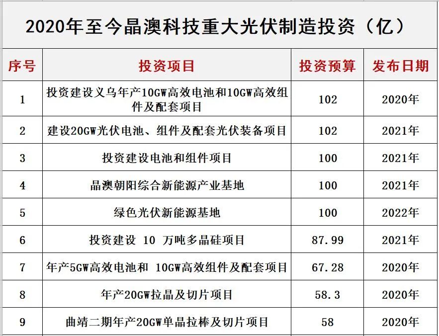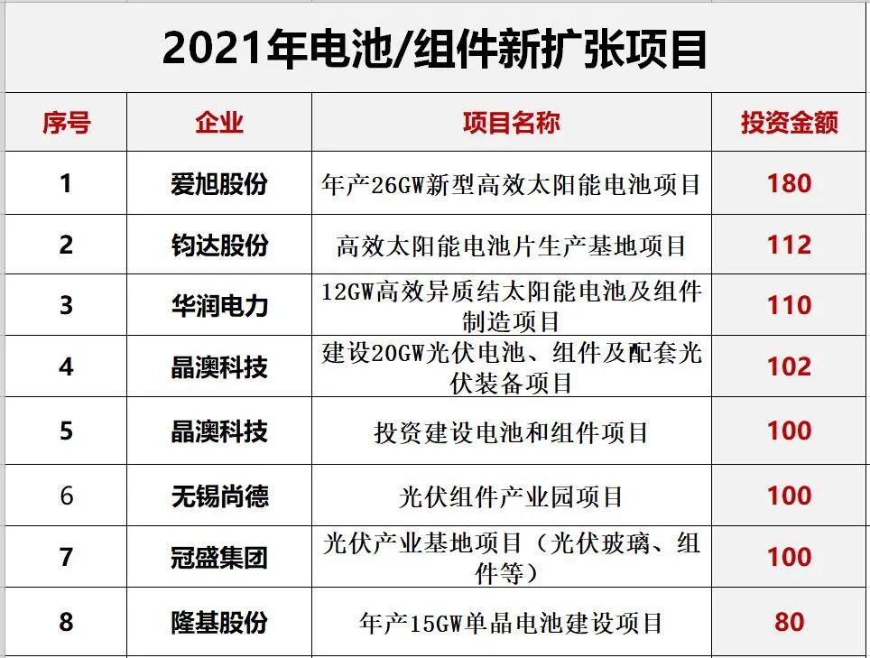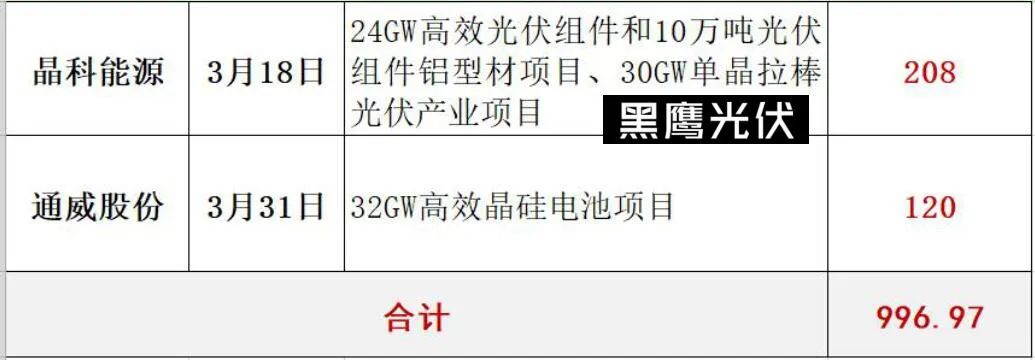3月18日晶科能源公告,拟在西宁经济技术开发区所辖南川工业园区内规划投资建设30GW单晶拉棒光伏产业项目,项目总投资约100亿元(含流动资金);拟在上饶市广信区投资建设24GW高效光伏组件和10万吨光伏组件铝型材项目,项目总投资约108亿元(含流动资金)。