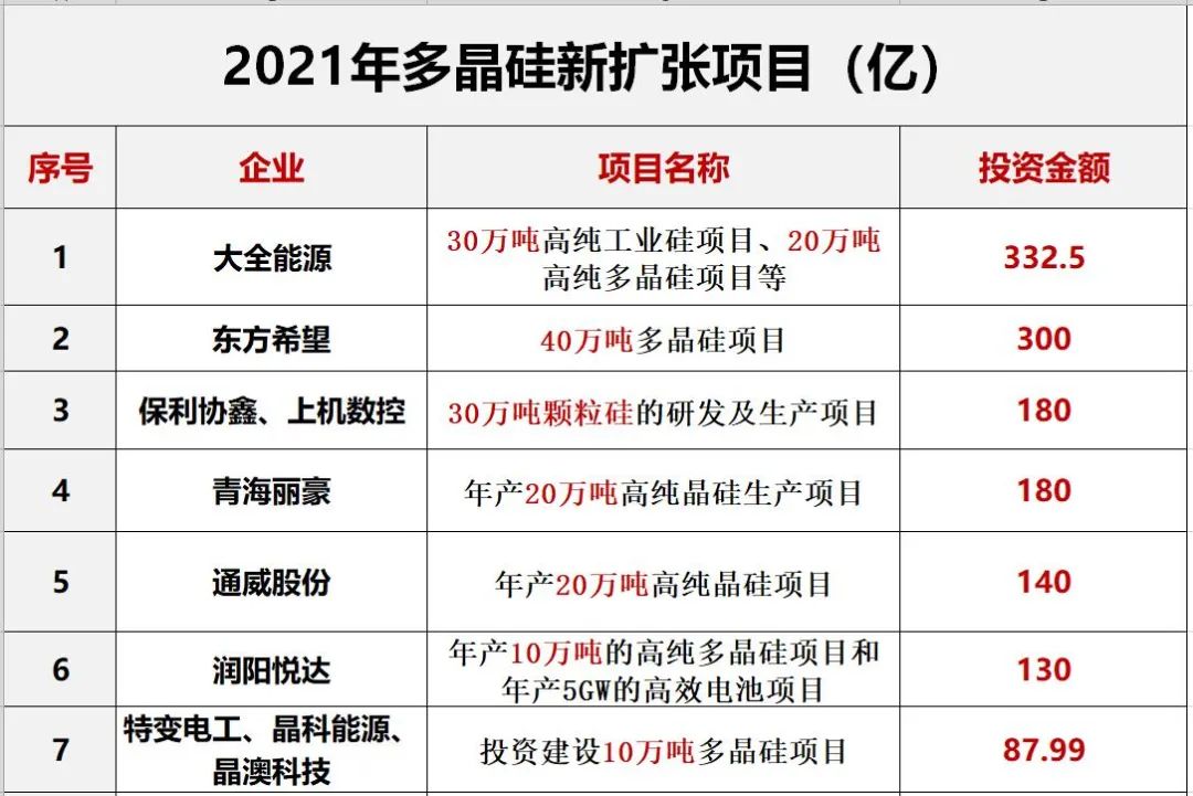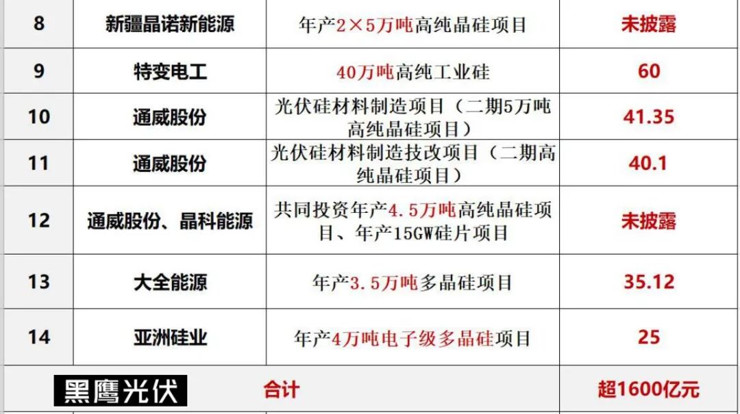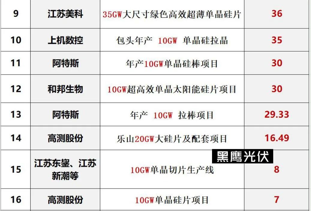 比如,东方希望1500亿砸下光伏,3月中旬,年产40万吨多晶硅、10GW硅片、10GW电池片、25GW组件的一期项目开工。