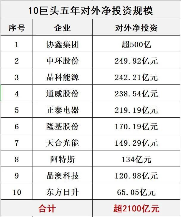 若梳理统计从2020年至今,通威、隆基、天合、晶科等龙头企业在制造环节的投资,我们可以发现,9大光伏龙头的投资总额超过了5400亿元,具体如下表:
