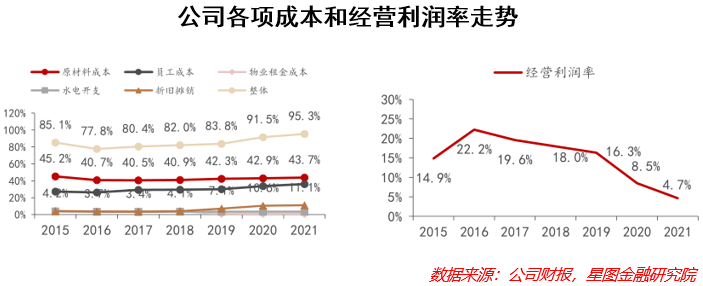 至于成本端,原材料和员工成本均有所上升。财报数据表明,2021年原材料成本占公司收入比为43.7%,比2020年提高了0.8pct;员工成本占公司收入比为36.2%,比2020年提高了2.4pct,主要由员工工资刚性、部分员工薪资水平上升等因素所致;物业租金及相关开支占公司收入比为0.8%,同比大体持平;折旧及摊销成本占公司收入比为11.1%,比2020年提高了0.5pct。