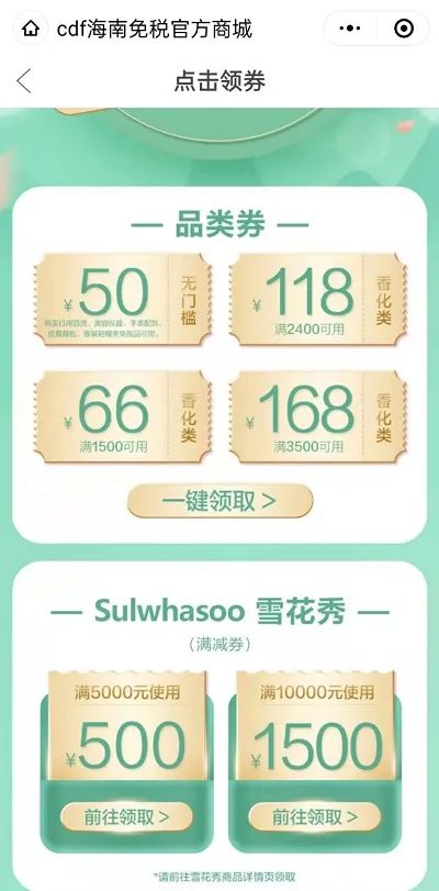 首先,免税品企业开设线上商城,例如在微信小程序上线cdf海南免税官方商城、与京东合作海旅免税城会员购等。依托“离岛邮寄送达”政策,消费者只需在订单信息中填写离岛信息即可购买。并且在线上商城内,各免税品企业还会定期发放优惠券,放利刺激消费。