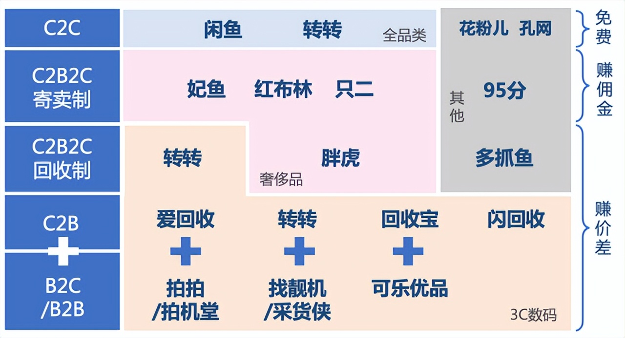 市面上主要二手电商的主营品类及模式(来源:银杏财经)