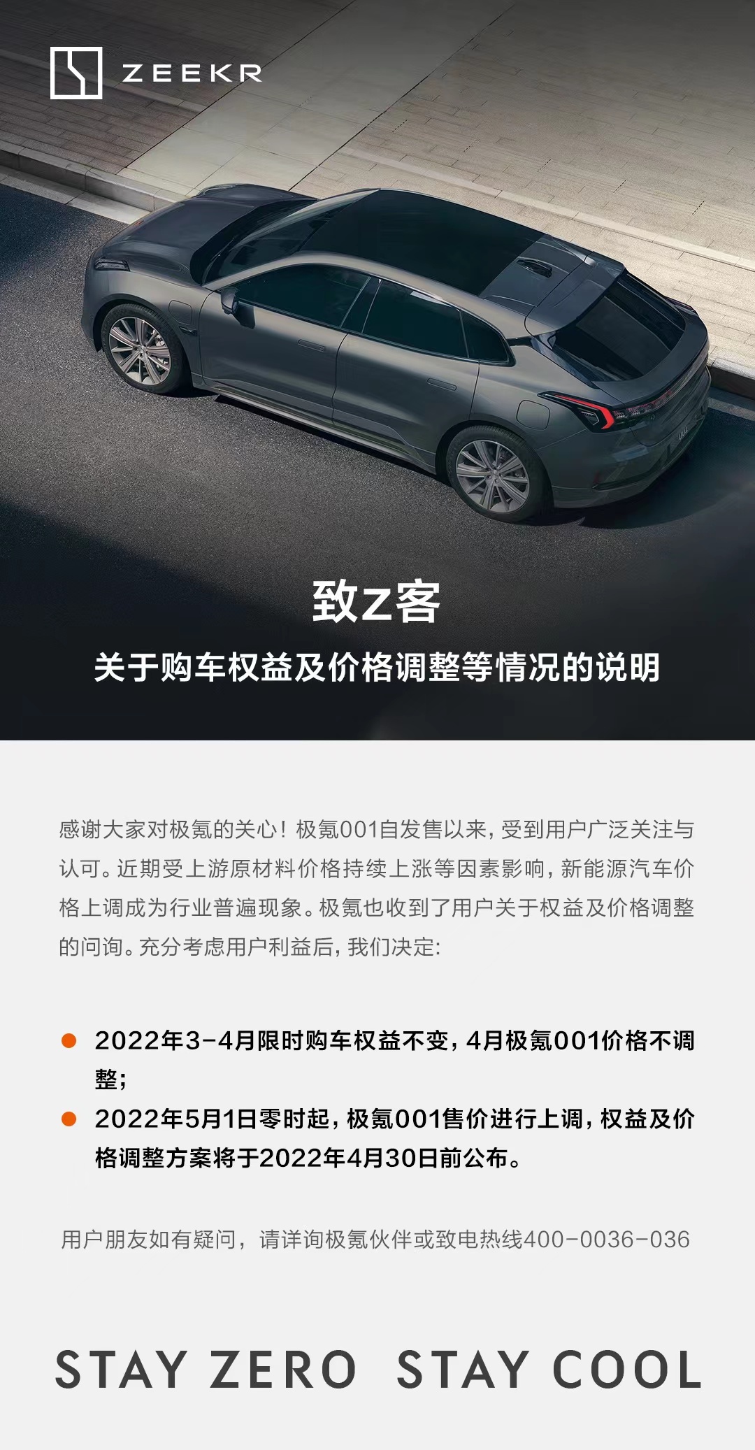 4月2日,极氪官方宣布,充分考虑用户利益后,其决定:2022年3-4月限时购车权益不变,4月极氪001价格不调整;5月1日零时起,极氪001售价进行上调,权益及价格调整方案将于4月30日前公布。
