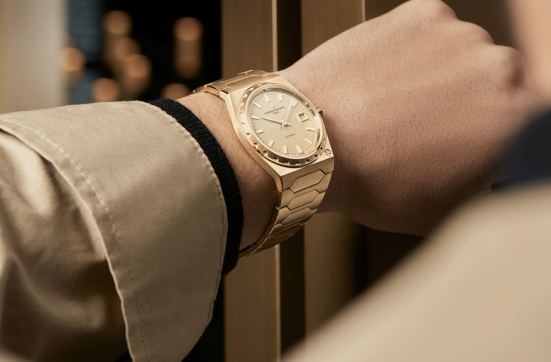 在现存的各类222表款中,江诗丹顿选择以直径37毫米、采用18K 3N黄金材质打造的参考编号44018腕表作为此次传奇经典重塑的原型。这款作品标志着品牌风格演进过程中的一次全新突破,为腕表中巧妙融入运动元素,线条硬朗、棱角分明。新款腕表以18K 3N黄金材质打造,保留了222腕表的标志性元素,包括直径37毫米的表壳、凹槽表圈、金色调表盘、条形时标和棒状指针、一体式表链及六边形中央链节,以及表壳5点位的马耳他十字标志。该标识由经抛光处理的Pd150白金制成,焊于扁平表壳上。