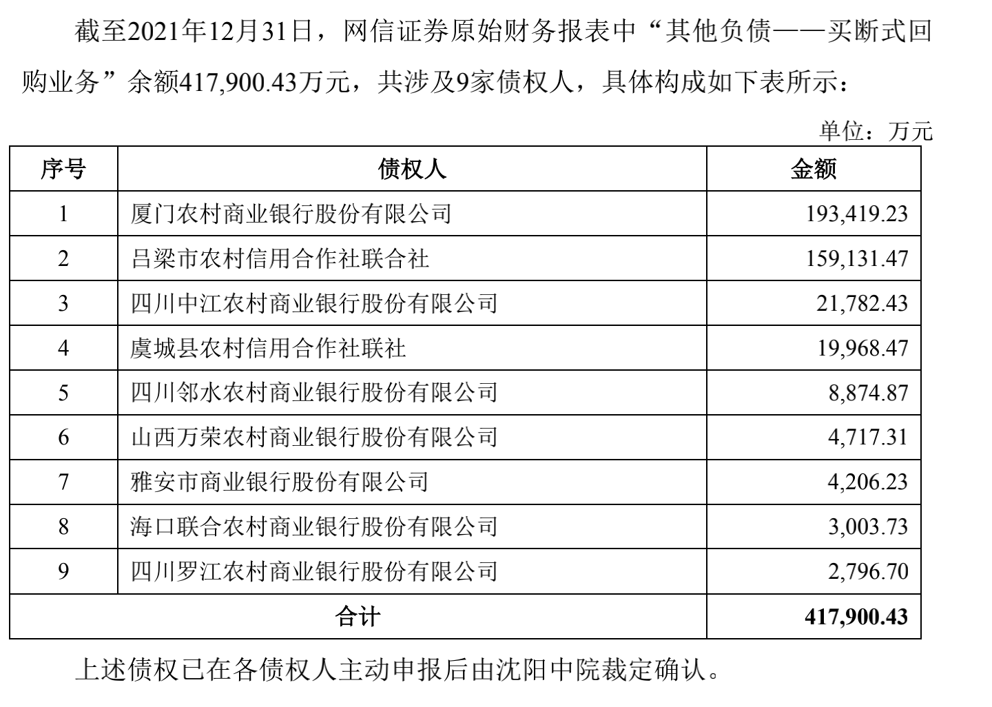 其中,网信证券前9大债权人的债权均在100万以上,最高为厦门农商行,普通债权为19.34亿元。9家债权人的普通债权总额达41.7亿元。