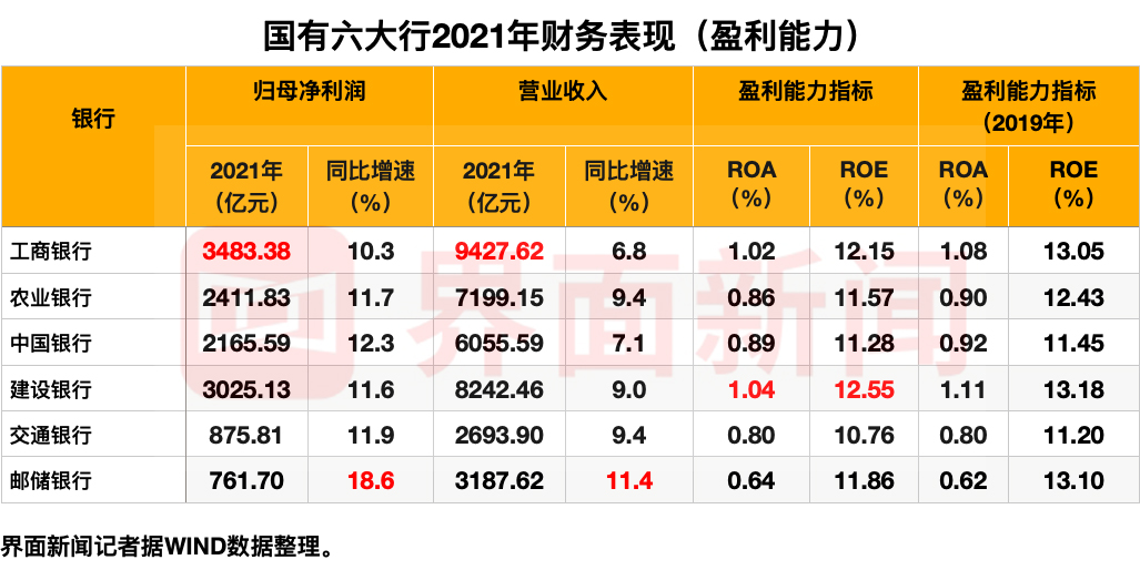 在2020年疫情、减费让利等因素导致的低基数影响下,国有六大行2021年的归母净利润均呈现了两位数的增长。