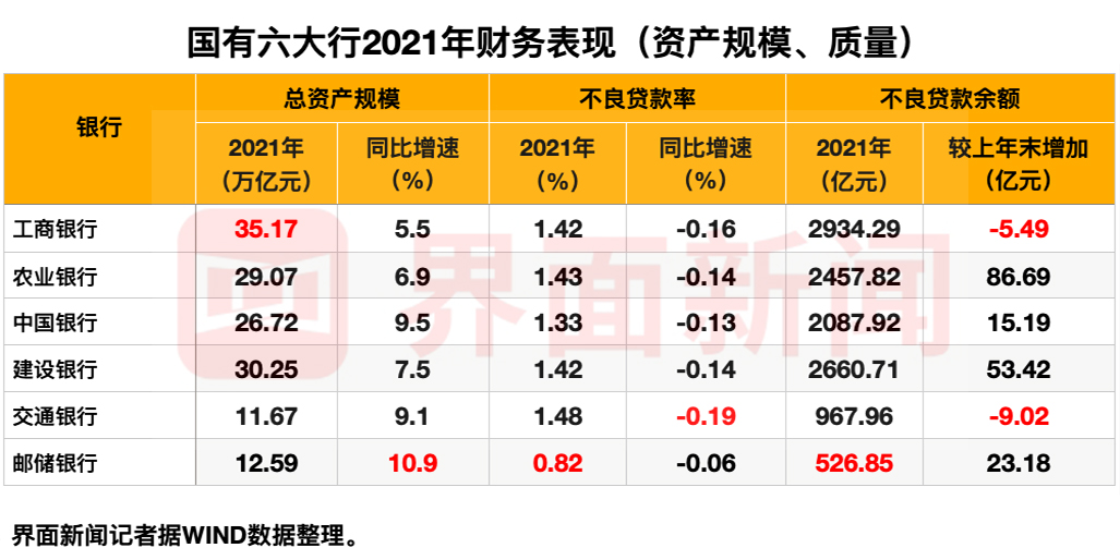 在资产规模上,工商银行的总资产依旧稳居第一,突破35万亿元;邮储银行的增速依旧为榜首,达10.9%。