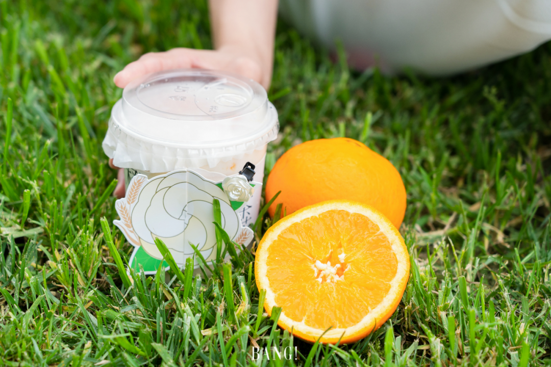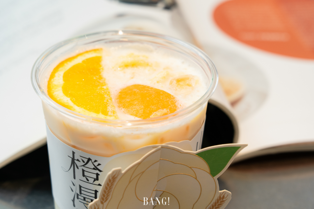 新品一杯融合了燕麦奶、山茶花香乌龙茶、香橙片等,图片来源:成都BANG