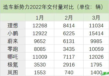 至于理想,交付了11034辆,位列第三位,算是正常水平发挥了。第四名,变成了零跑,3月交付了10059辆。蔚来则落到了第五名,总共交付了不到一万辆。