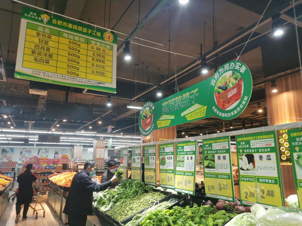 在合肥市的合家福超市丹霞翠微苑店内,多位市民正在选购蔬菜。记者看到,蔬菜区域上方“合肥市惠民菜篮子工程”的标牌上列明紫包菜、甘蓝等5种蔬菜,价格统一为0.99元/斤。与此同时,蔬菜区域还有两排10余种惠民菜,其价格均低于市场价。