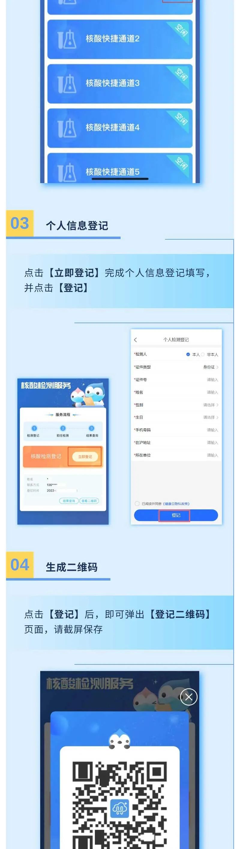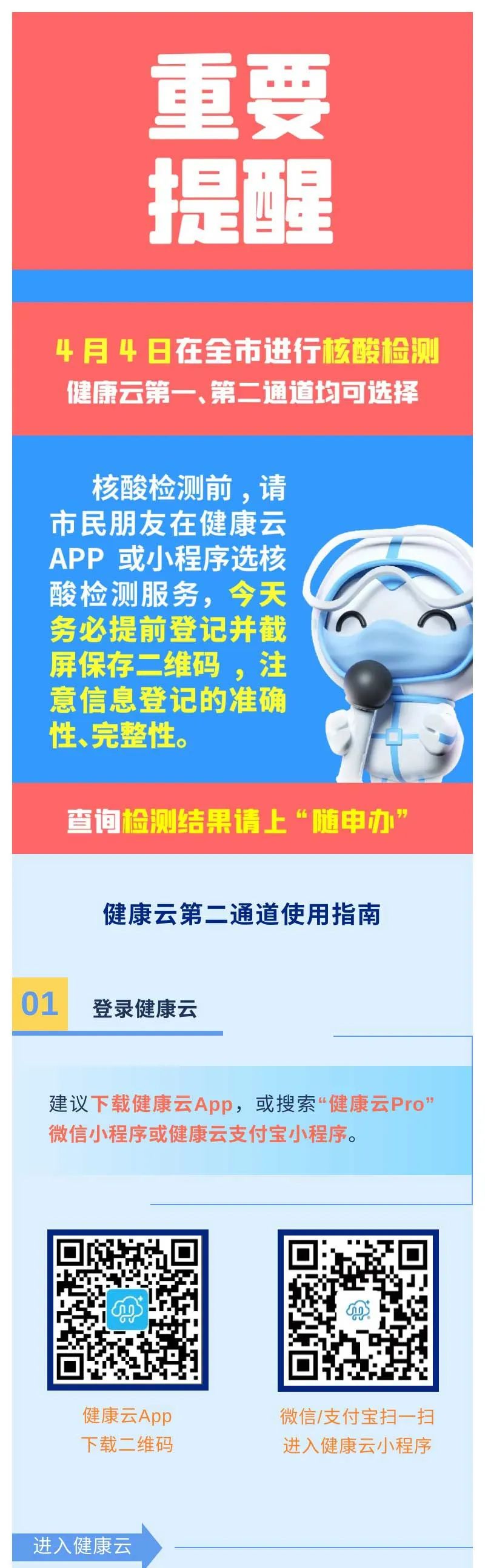 1.请今天提前在健康云APP或小程序选择“核酸检测服务”,登记并截屏保存二维码,注意信息登记的准确性、完整性。