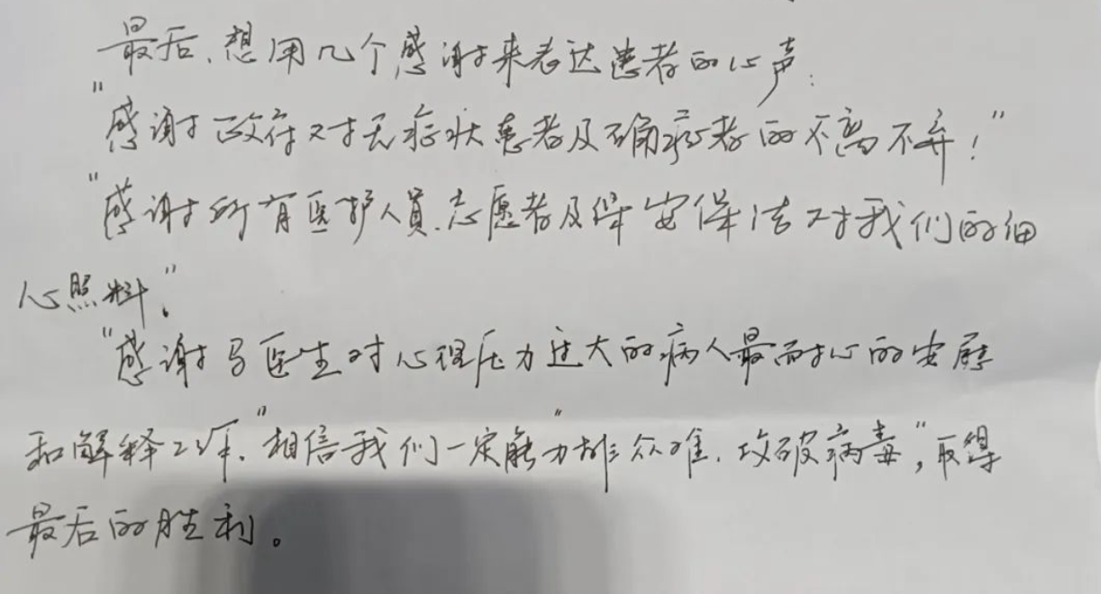 上述感染者在信中表示:“政府对无症状感染者和确诊病例的不离不弃;医务人员、志愿者、保安、保洁的悉心照料;马医生对心理压力过大的病人最耐心的安慰和解释工作,都让我们更加坚信我们可以力排众难、攻破病毒、取得最后的胜利!”