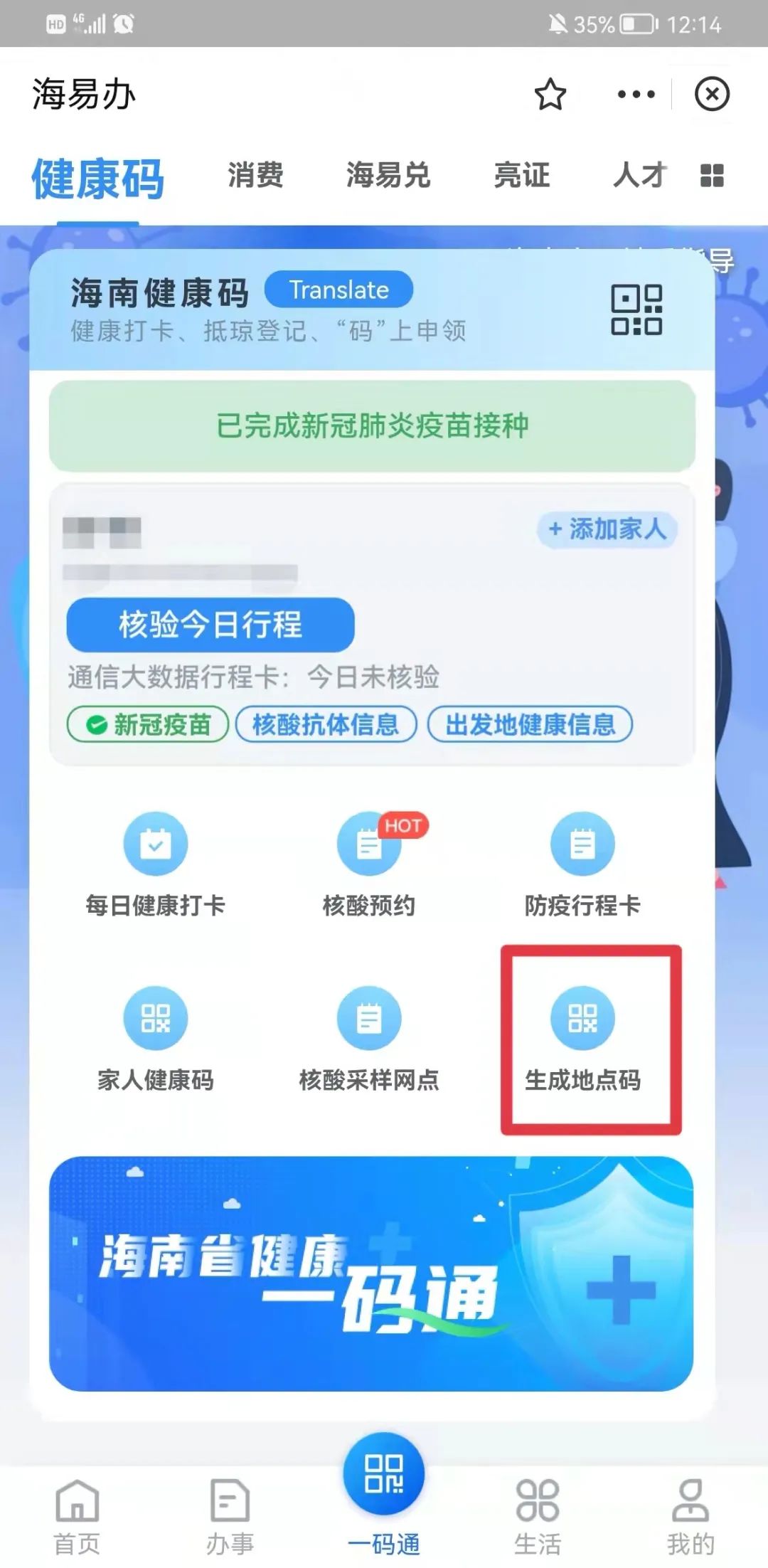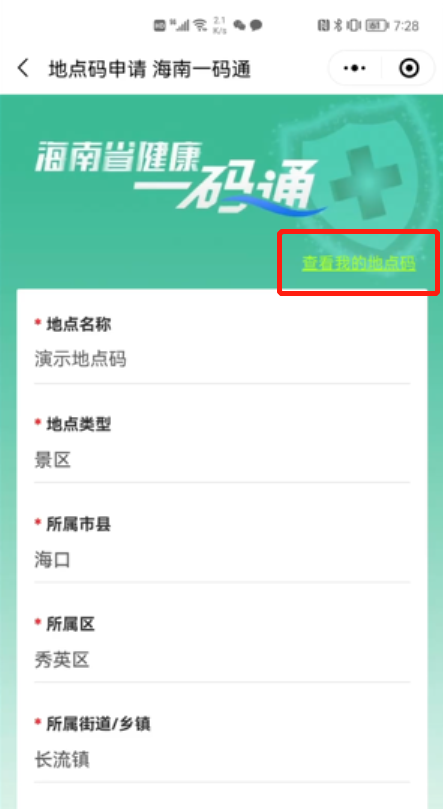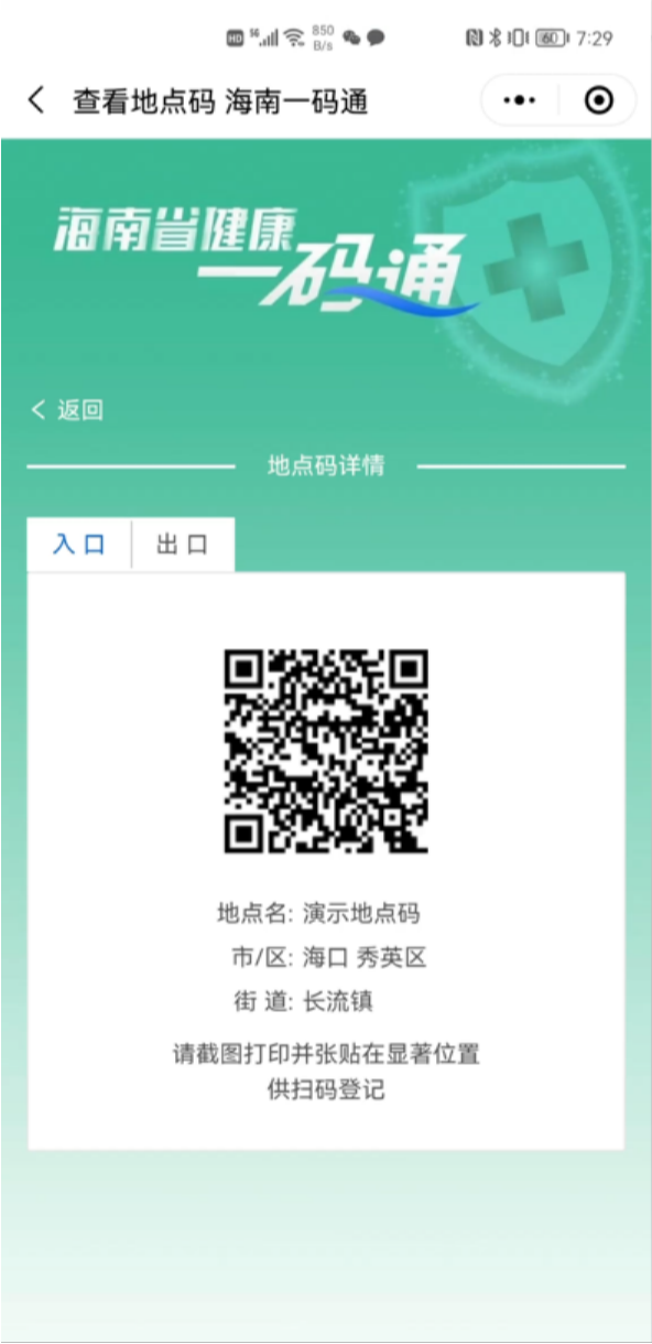 进入海南健康码首页——点击“生成地点码”——填写相关信息——生成地点码并截图张贴。