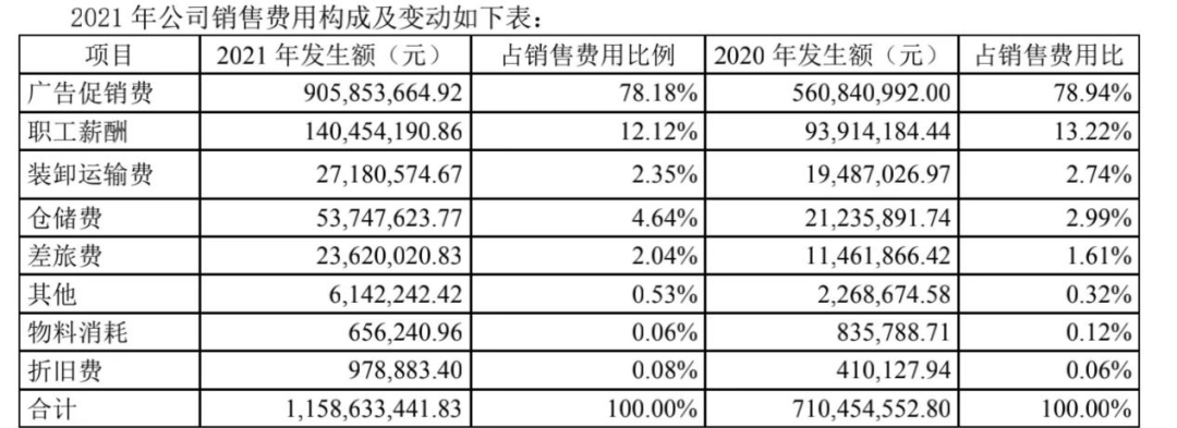 且在报告期内,公司广告促销费发生额为9.06亿元,占销售费用的比例高达78.18%,且广告促销费占公司全年营收的比例则高达20.23%。