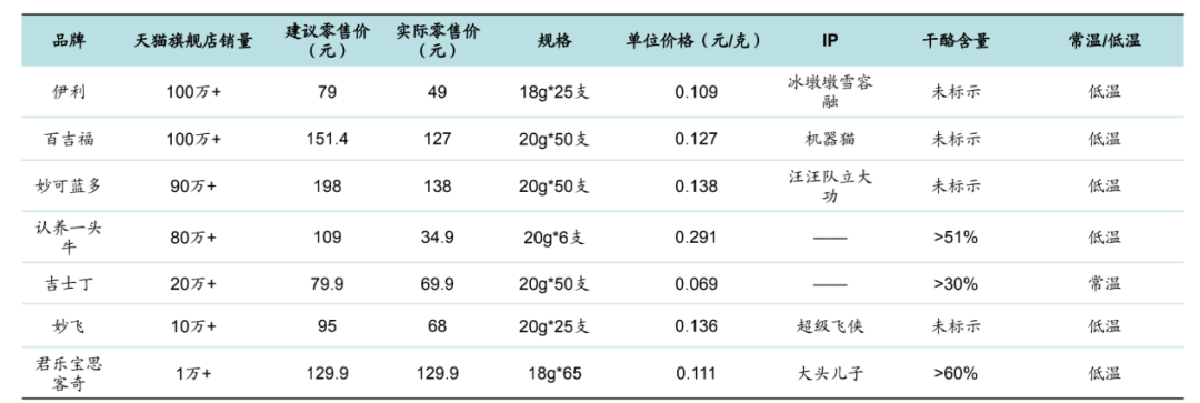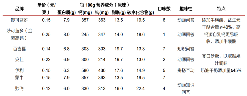 根据华安证券发布的《国内奶酪棒短期竞争加剧,品质差异化成为破局机会》(下称“《报告》”),随着新老玩家入局,打折促销成为常态。以电商渠道为例,头部品牌以低价策略抢占最大销量,例如伊利每克售价仅0.109元,而吉士丁的常温产品单位价格低至0.069元/克,而妙可蓝多的每克售价为0.138元,在价格方面并无明显优势。